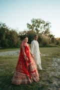 That afternoon, the Indian ceremony took place beneath a mandap envisioned as “whimsical, strong and intimate.” Guests sat in a half-moon formation. Floral designer Lily Fleur created four pillars of jewel-toned blooms—roses, hydrangeas, anthuriums and dahlias—for decor. Sweeney found her red lehenga by chance. “I caught sight of a lehenga hanging inside the store of independent designer Rhythm Aggarwal of Idaya and instantly knew it was my bridal look,” she says. Inspired by Jaipur and nature, the tiered skirt felt perfect. “I fell completely in love with its movement.” The designer’s family-run atelier added a surprise: Sweeney and Swarups initials stitched into the lehenga latkan.